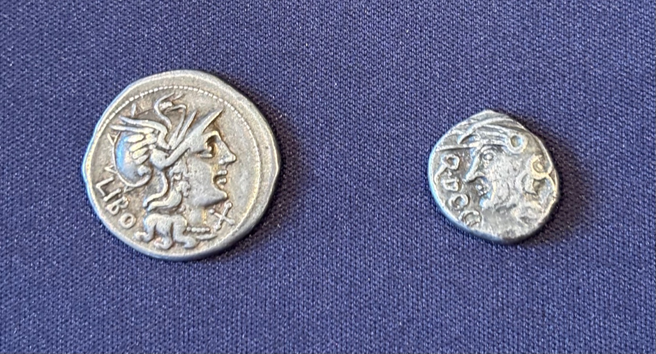 On the left is a common denarius from the Roman Republican period, which depicts the head of Roma, the personification of Rome who was worshipped as a deity. The moneyer who produced the coin was Q. (for Quintus) Marcius Libo. On the right is a quinarius (equivalent to half a denarius) from the Sequani tribe of Gaul. Some numismatists (although not all) describe the figure on the Celtic coin as a ‘Celticized head of Roma’. It certainly has the appearance of a deity, with its stern features and stylised headdress although whether this was indeed supposed to represent Roma, or perhaps a Celtic god, is ultimately unknown.